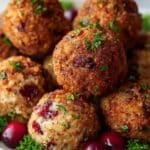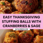 These Thanksgiving Stuffing Balls are a delicious and festive side dish made from breadcrumbs, cranberries, sage, and savory aromatics. Baked to a perfect golden brown, they combine a moist, flavorful stuffing mixture rolled into bite-sized balls, making them an easy and elegant addition to your holiday meal.