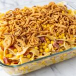 - Add Topping: Sprinkle the French fried onions evenly over the top of the casserole for a crispy, crunchy finish.
